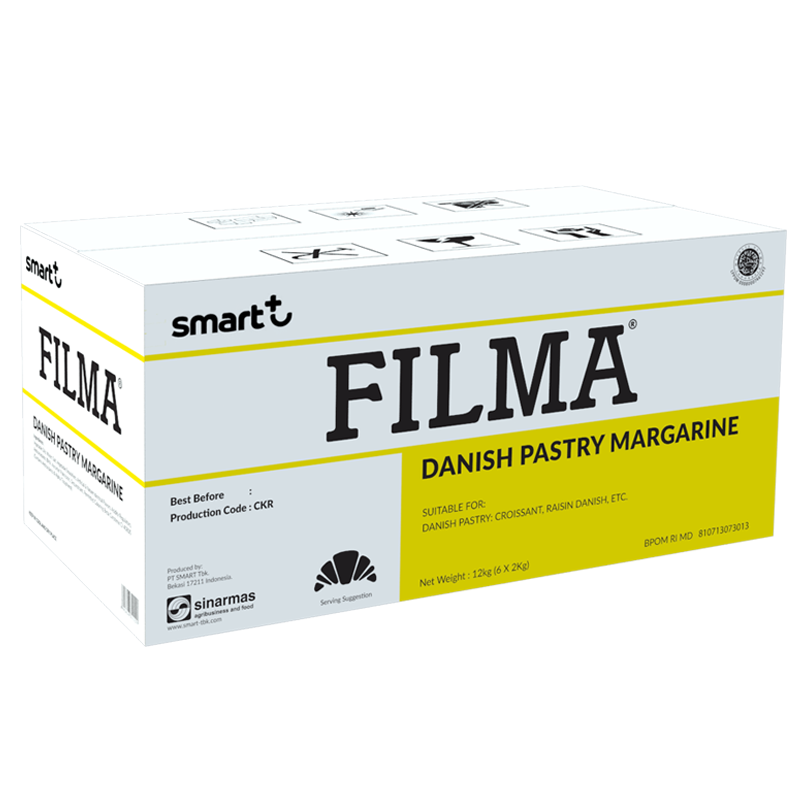 Filma Danish Pastry Margarine adalah lemak nabati yang dirancang khusus untuk pembuatan adonan danish pastry. Terbuat seluruhnya dari minyak nabati yang sudah dimurnikan dan dihilangkan baunya. Filma Danish Pastry Margarine memiliki plastisitas dan titik leleh yang sangat baik sehingga menghasilkan pengembangan lapisan dan struktur crumb yang optimal pada danish pastry. Filma Danish Pastry Margarine memberikan rasa dan aroma butter yang khas pada saat pemanggangan.