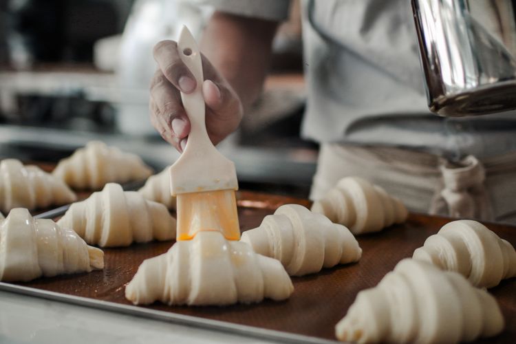 Croissant dibuat dari lapisan adonan yang digulung dan dilipat membentuk bulan sabit. Setiap lapisannya dilapisi butter untuk memperoleh tekstur berlapis yg crispy namun lentur seperti puff pastry.