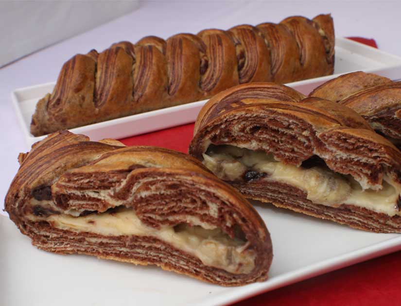 Timbang adonan masing masing 250 gr utk menghasilkan 1 buah roti. Kemudian tipiskan adonan polos hingga ketipisannya +/- 1 cm. Letakkan adonan coklat di atas adonan polos, kemudian lipat 2x single dan diamkan selama 10 menit.