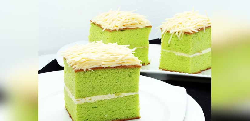 - Tuangkan adonan pada 2 loyang kotak ukuran 24 x 24 x 3 cm yang sudah dialasi kertas roti.dan dipoles lemak putih, lalu spuitkan sebanyak 5 baris adonan pandan.
