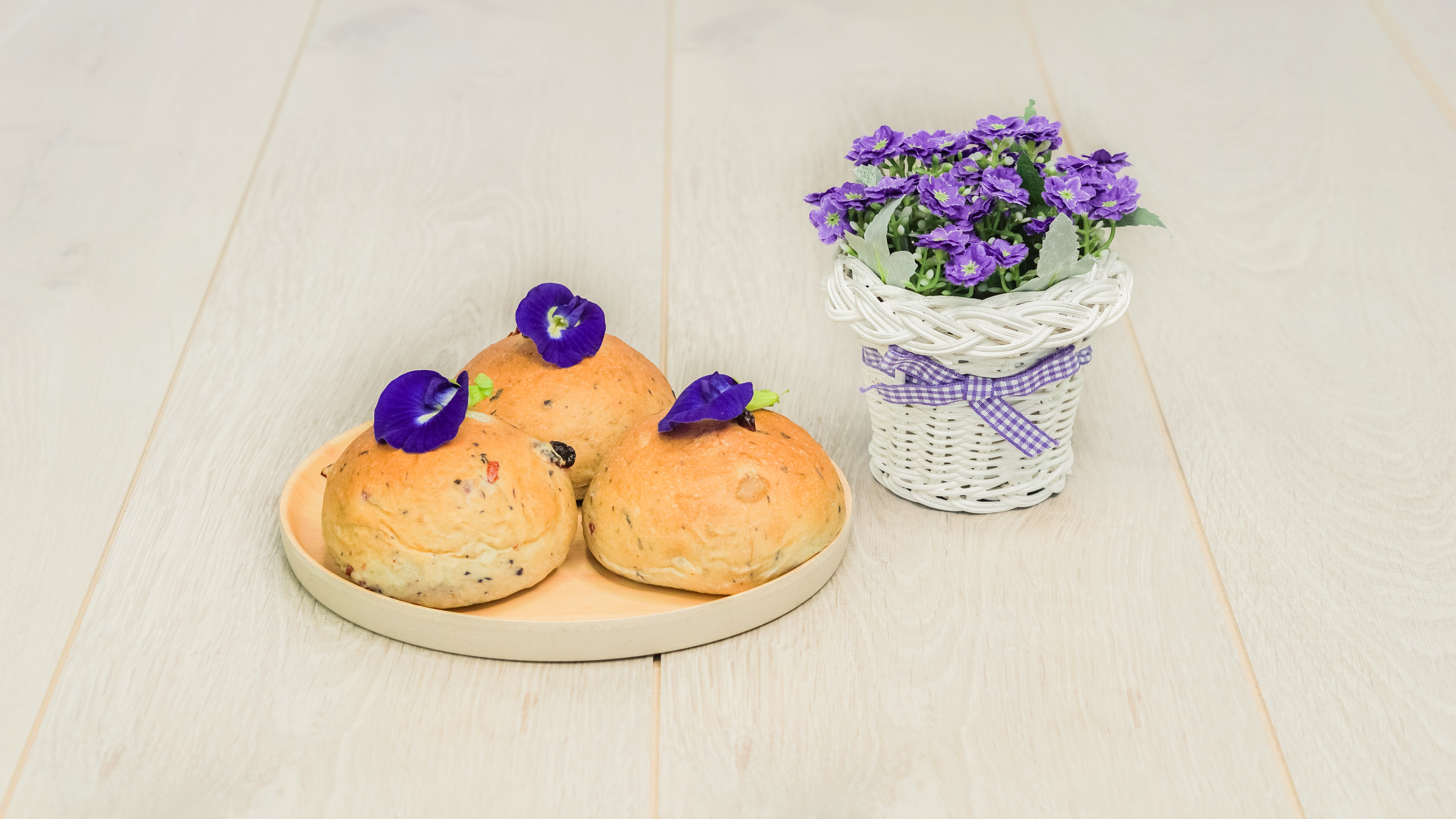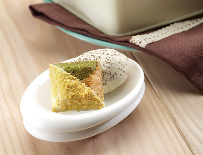 - Bagi adonan menjadi 2 bagian ± 318 gram, adonan pertama diberi corn flakes dan air jeruk lemon, adonan kedua diberi green tea powder dan kacang almond.