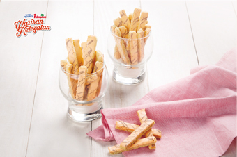 Kocok bahan A sampai mengembang masukkan bahan C aduk merata tipiskan adonan tersebut dengan ketebala 4ml cetak dengan ukuran panjang 5cm x 2cm poles dengan kuning telur, lalu taburi dengan kacang kenari yang dicincang kasar