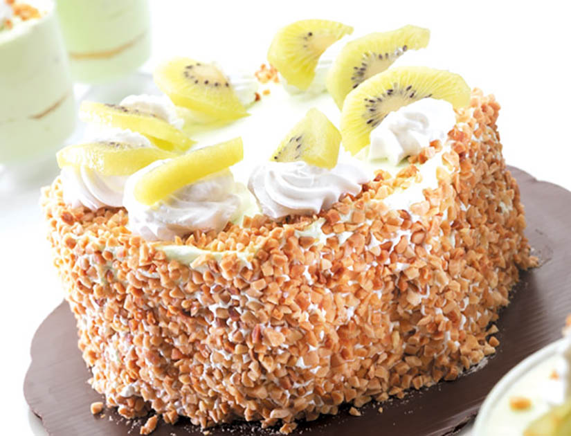 Dengan menggunakan ring bulat ukuran 22 cm, taruh selembar Sponge Vanilla basahi dengan simple syrup. Tuang Kiwi Mousse hingga setengah bagian, tambahkan irisan buah kiwi, taruh kembali selembar Sponge Vanilla yang dibasahi dengan simple syrup, tuang sisa Kiwi Mousse. Kemudian dinginkan dalam freezer hingga mengeras, setelah keras buka ring-nya, beri pinggiran kue dengan croquant atau almond diced. Hias atasnya dengan whipped cream dan buah kiwi.