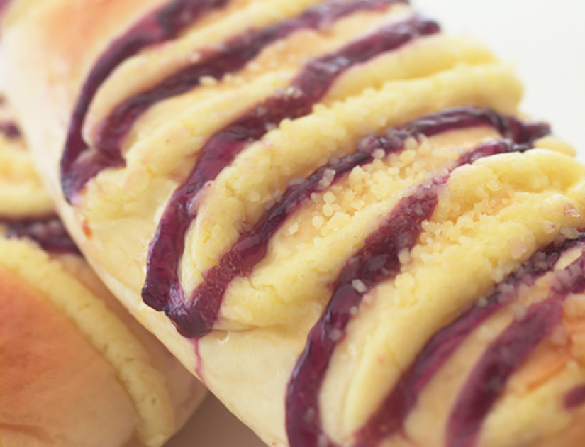 - Biarkan adonan sampai mengembang dua kali dari ukuran semula, lalu poles permukaannya dengan susu evaporated. Spuitkan topping vla instant dan selai blueberry bergantian, lalu taburi dengan streussel.