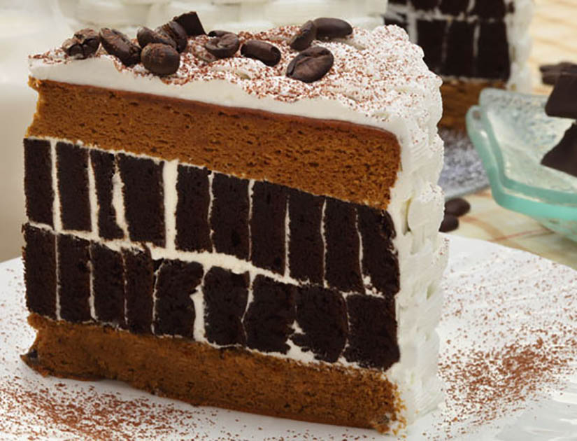 - Poles 1 bagian cake mocha dengan buttercream lalu poles cake coklat dengan buttercream. Potong ukuran 3cm lalu gulung bentuk gulungan dan taruh di atas cake mocha, lakukan sampai cake coklat berbentuk bulatan seukuran cake mocha