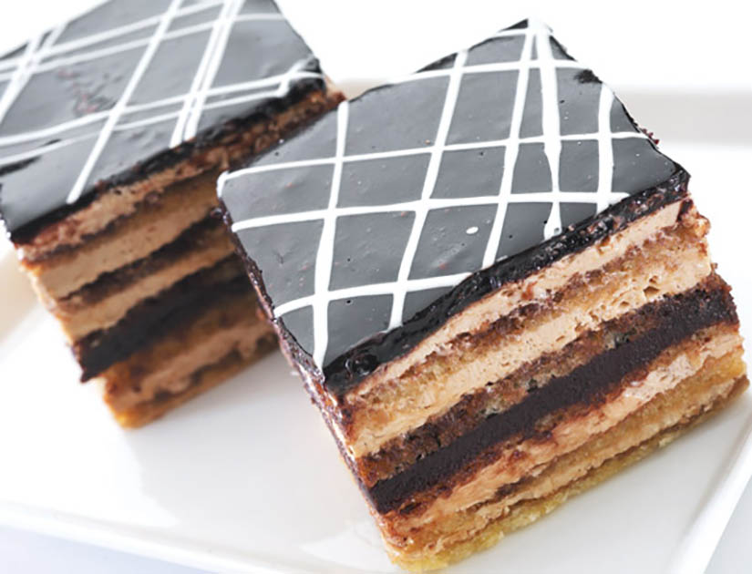 - Letakkan almond progress ketiga, basahi dengan rum coffee syrup, oles atasnya dengan 100 gr chocolate ganache.