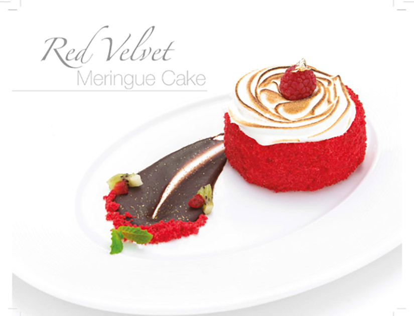 Cetak Cake Red Velvet berbentuk bulat, lapisi dengan Meringue, lalu lapisi dengan Red Velvet Crumb Cake yang sudah di haluskan.