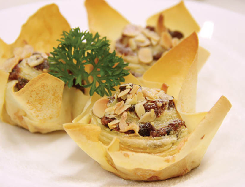 Ambil selembar kulit lumpia kemudian bungkus dan letakkan dalam loyang muffin. Oles atasnya dengan telur dan taburi dengan almond slice.