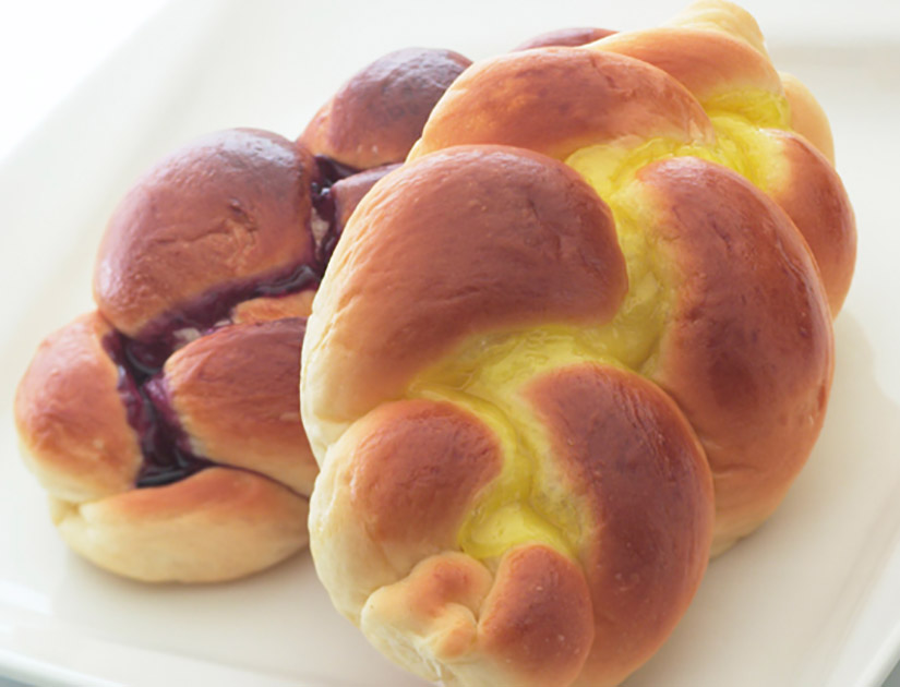 Biarkan adonan mengembang dua kali dari ukuran semula semula lalu poles dengan susu evaporated kemudian spuitkan selai blueberry atau selai lemon di atas lipatan kepang.